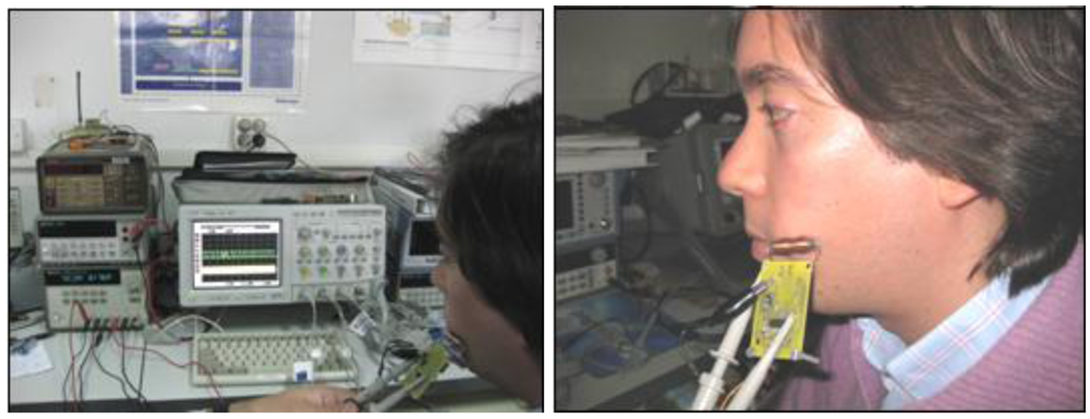 The external interrogator was always placed against the face of the patient (30 year old researcher without occlusal problems) so that the relative position between the passive sensor and the interrogator would not change. It is important to note again that no wired connection was used between the intraoral instrumented splint and the external interrogator, as the system works by wireless magnetic field communication. The cables seen in Figure 8 just connect the external interrogator to the battery package and to the oscilloscope for measurement recording.