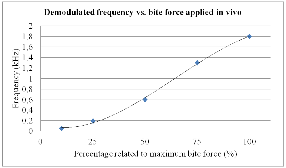 During the in vivo trials, bruxism events were deliberately simulated to verify the capability of the system to quantitatively assess events of different magnitudes. The researcher was first asked to consciously bite with maximum force. Afterwards, he was requested to apply bite forces of different magnitudes relative to the initial bite force applied (75%, 50%, 25% and 10%) to assess system behavior within the mouth of a person and its quantification ability, as shown in Figure 9. Such in vivo trial was intended to provide a conscious simulation of different bruxism events, as well as to assess the mechanical stability and performance of the prototype inside patient's mouth. Each bite force level was repeated five times and maintained for 5 seconds, with a rest interval of 10 seconds between each measurement, so as to verify repeatability of the measuring system. For each bite force level, final standard deviation obtained was below 15%, what we consider adequate for prototype quality validation and taking into account the limitations of in vivo probing, highly useful for assessing the device integrity and response in real working conditions, but somehow limited when trying to simulated similar events several times. With the calibration curve of the constructed splint (see Figure 5), such demodulated frequencies can be related to actual bite forces.