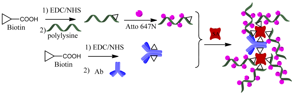 Here, we present a novel signal amplification strategy in LFIA, which adopts three amplification steps: (a) biotin-streptavidin amplification; (b) polylysine amplification; (c) fluorescence dye signal amplification. The biotin-streptavidin system (BSAS) has been widely applied in immunohistochemistry and immunoassay for its high specificity and strong affinity [45,46]. Streptavidin (SA) contains four binding sites with an extraordinarily high affinity for biotin.