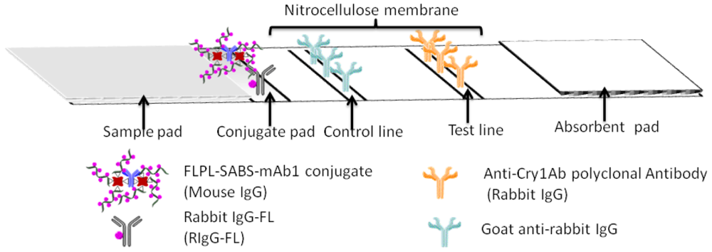A nitrocellulose (NC) membrane, absorbent pad, sample pad, conjugate pad, and backing cards were purchased from Millipore (Bendford, MA, USA). Purified Cry1Ab protein, rabbit polyclonal antibody against Cry1Ab (pAb2), mouse monoclonal antibody against Cry1Ab (mAb1) and Bt Cry1Ab/1Ac/1F ELISA Kit were obtained from Abraxis LLC (Warminster, PA, USA), while Atto 647N (λabsmax = 644 nm, λemmax = 669 nm), polylysine (30–70 KD), bovine serum albumin (BSA), N-(3-dimethylaminopropyl)-N′-ethylcarbodiimide hydrochloride (EDC), N-hydroxysuccinimide (NHS), streptavidin (SA), biotin and dimethyl sulfoxide (DMSO) were from Sigma (St. Louis, MO, USA). Other Cry proteins (Cry1C, Cry2A, Cry3A) were from Agdia Inc. (ElKart, IN, USA). Goat anti-rabbit IgG (GAR, >95%), rabbit IgG (RIgG, >95%) were obtained from Longji (Hangzhou, China). Dialysis tubing (20 KD) was from Spectrum Labs (Rancho Dominguez, CA, USA). All other analytical purified reagents were purchased domestically without further treatment or purification.