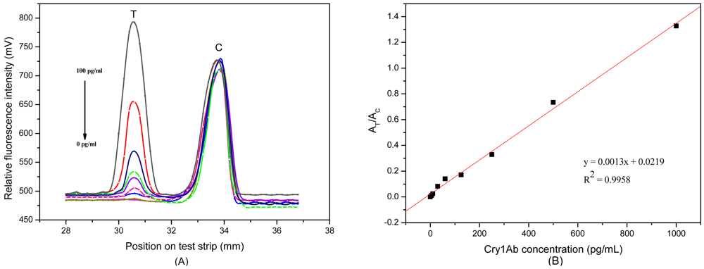 Prior to the immunoassay, varying concentration of Cry1Ab standard solutions ranging from 0 to 1,000 pg/mL, were prepared by dilution in PBS buffer. One hundred μL of sample was loaded onto the sample pad of the strip, the test cartridge was inserted into the portable fluorescence strip reader after 10 min. The intensities of fluorescence conjugates on the detection zone were scanned and converted to area values. All experiments were performed in triplicate, and the average of the triplicates was used for the analysis.