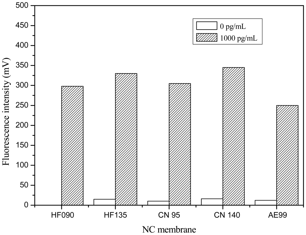 Five kinds of NC membranes (Millipore HF090, Millipore HF135, Sartourius CN95, Sartourius CN 140 and Whatman AE99) from different manufacturers were tested, respectively, according to the procedure described in Section 2.5. In this investigation, C line was coated with 1 mg/mL GAR, and T line was coated with 1 mg/mL pAb2. PBS buffer (10 mM, pH 7.4) was used as negative sample. After chromatography for 10 min, signals at the T and C line were measured.