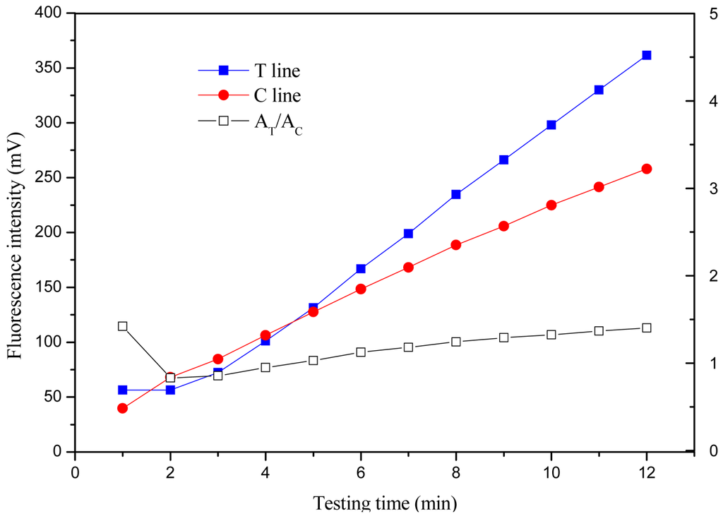 The T line and C line signals increased rapidly during the first 25 min, between 25 and 45 min, the signals increased slowly and entered a plateau (data not shown). The time-signal ratio AT/AC curves of the first 12 min have been observed, and indicated that AT/AC would vary in the first 9 min, then gradually plateau, indicating the signal intensity was relatively stable for analysis (reading) over 9−12 min. With consideration of signal intensity for low concentration sample and the shortest time for detection, the detection time was considered as 10 min.
