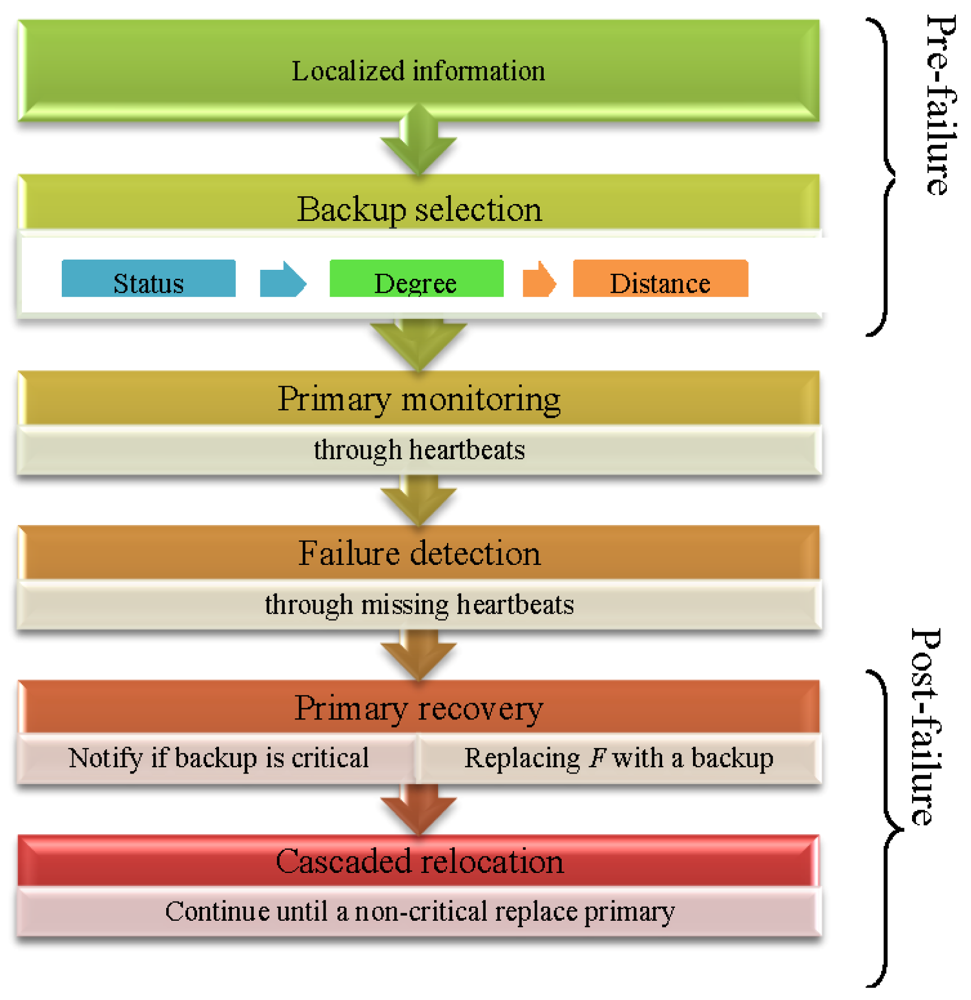 Figure 3 shows the overall working of the PCR algorithm. In the pre-failure planning, PCR identifies critical/non-critical actors (primary) based on localized information and designates an appropriate backup for each critical node. The backup starts monitoring its primary and detects the failure through missing heartbeats. In the post-failure recovery, a pre-designated backup if critical notifies it's backup and moves to the location of the primary. This cascaded relocation continues until a non-critical replaces the primary. The detailed algorithm is described in the sections that follow.
