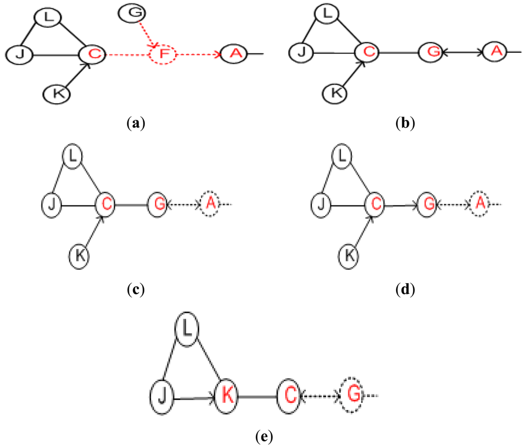 The pre-assigned backup immediately triggers a recovery process once it detects failure of its primary. The status of backup determines the scope of recovery which can be among the following three scenarios. First, if a backup is a non-critical node the scope of recovery will be limited because it does not require further relocations. The backup actor moves to the location of the failed primary and exchanges heartbeat messages with its new neighbors. It selects and designates a new backup since it has become a critical node at the new position. This movement alerts the other primary nodes (if any) at the previous location to choose a new backup for themselves. An illustrative example is provided in Figure 5(a), where non-critical backup G simply replaces its primary (i.e., F) and selects a backup for itself. The second scenario is when the failed (primary) and backup node are both critical nodes and simultaneously serving as backup for each other. This scenario is articulated in Figure 5(b). Actor G is serving as backup of another actor A and vice versa as shown in Figure 5(b). The actor G detects failure of A and selects another actor “C” as backup, as shown in Figure 5(d). Then G moves to the position of A. The newly assigned backup actor performs a cascaded relocation as discussed below and is shown in Figure 5(e), with G replacing A, C replacing G and K replacing C. The third scenario is when the backup is a critical node. In this case, the backup actor will notify its own backup so that the network stays connected. This scenario may trigger a series of cascaded repositioning of nodes as explained above.