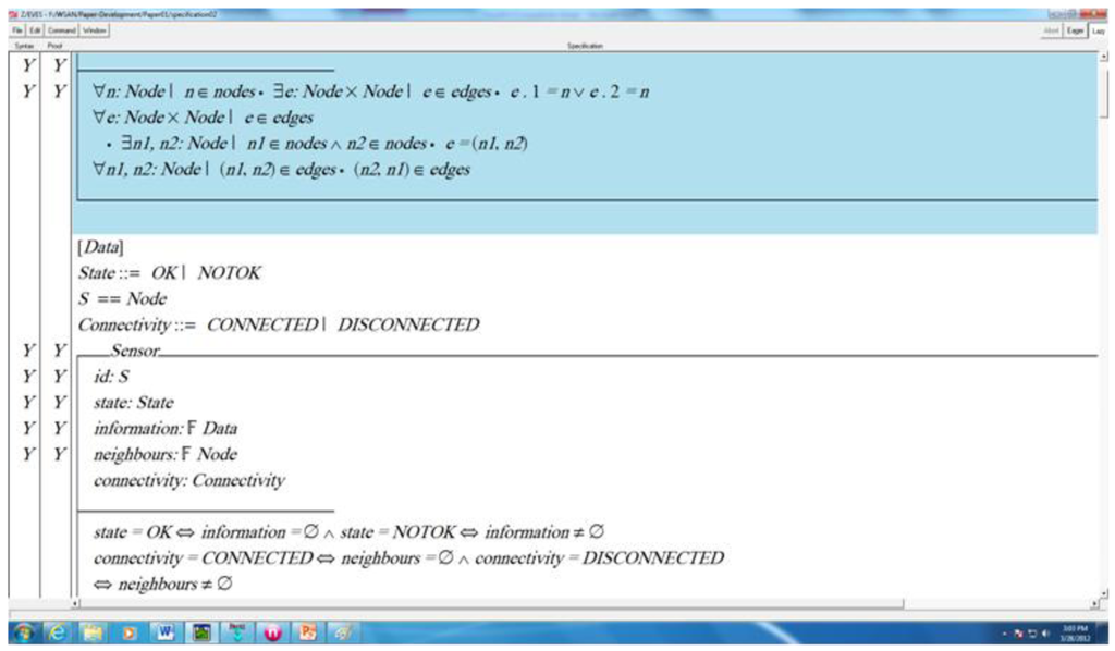 The Z/Eves is one of the powerful tools used for the analysis of Z specifications which is applied to analyze the system's schema expansion, pre-condition calculation, domain checking, syntax and type checking, and theorem proving. This is why we have used Z/Eves for analyzing the Z specification of hybrid connectivity restoration algorithm for WSAN. A snapshot of the specification analysis is presented in Figure 7. The first column on the left of the figure shows syntax checking and the second column represents the proof correctness of the specification. The symbol ‘Y’ shows that the formal specification is syntactically correct and proof is also correct, while the symbol ‘N’ represents that errors exist. All the schemas are checked to prove that specification is correct in syntax and has a correct proof. Some schemas of the specification were proved using reduction techniques available in the toolset.