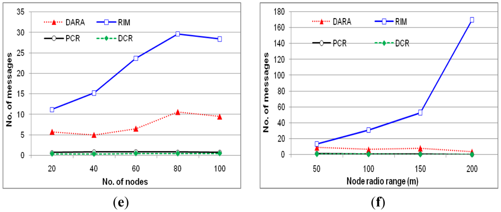 Figure 8(e,f) show the coordination messaging overhead as a function of the N and r. As expected, hybrid schemes (PCR and DCR) cause far less coordination overhead than DARA and RIM. This is because they limit message exchange only between a pair of primary and backup instead of all 1-hop and 2-hop neighbors as is the case in RIM and DARA respectively. In addition, unlike reactive schemes, PCR and DCR strive to engage non-critical nodes in the recovery which does not require coordination messages. Figure 8(e) shows that the messaging overhead of reactive schemes increases with the high node density. This is because the number of 1-hop and 2-hop neighbors increases. Moreover, Figure 8(e,f) indicate that the messaging overhead in RIM significantly grows for a high actor density and long communication range because the number of recovery participants increases in both cases. On the other hand, the performance gap between PCR and DCR is minor relative to DARA and RIM.