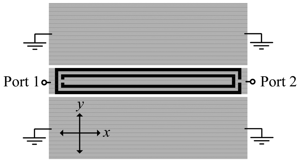 The layout of the designed sensor is depicted in Figure 2. The considered substrate is the Rogers RO3010 with dielectric constant εr = 10.2, thickness h = 127 μm, and loss tangent tanδ = 0.0023. As discussed in [1], narrow substrates are necessary to boost the sensitivity. For these very narrow substrates, the coupling between the inner and the outer ring of the SRR (Figure 1) is negligible. In the present work single ring SRRs are considered, whose second resonance frequency is located beyond the one of SRRs with two rings [12], and this is important to avoid interference between the transmission notches of different resonators. The vias and backside strips are used to connect the ground plane regions and thus prevent the appearance of the CPW parasitic slot mode.