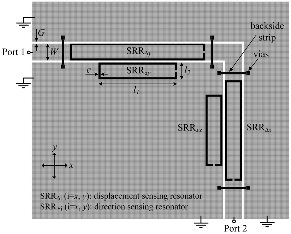 In order to extend the sensing capability to two dimensions for alignment and linear displacement, one possible strategy is to introduce a right angle bend in the CPW transmission line, and to etch an SRR in each CPW section. Obviously, these SRRs must be tuned at different frequencies in order to discriminate between displacement in the x- or y-axis. However, by these means it is not possible to distinguish between up or down and right or left shift in the y and x orientation, respectively. Our proposal to detect the displacement direction consists of introducing two additional resonators, one in the x-oriented CPW section and the other one in the y-oriented section, both etched also in the back side of the substrate, but situated beneath one of the CPW ground planes, near a CPW slot. If the displacement direction drives such additional resonators towards the slot of the CPW, this will be detected by a notch at the resonance frequency of these resonators. Conversely, by shifting the SRRs in the opposite direction such notch will not appear. Since it is necessary that the four required SRRs are tuned at different frequencies, the resonators dimensions must be different. Notice that these two additional resonators are introduced to simply detect the displacement direction (they do not provide information on the displacement magnitude). Therefore, we can call these SRRs as direction sensing resonators, to differentiate them from the displacement sensing resonators, those which measure the linear displacement magnitude.