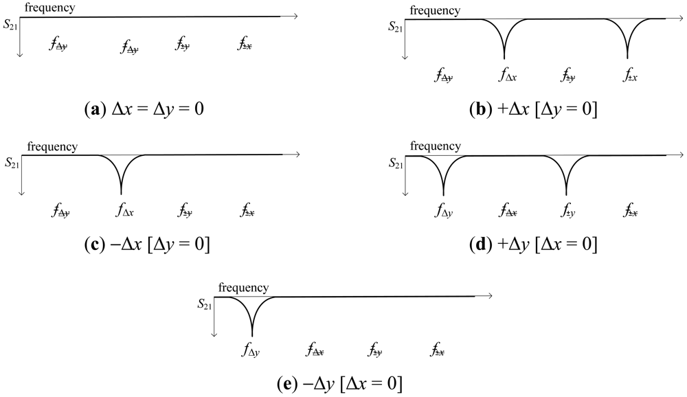 Figure 3. Scheme indicating the primitive shifting operations and the resulting transmission coefficient S21. A notch is indicative of an SRR excitation. A linear displacement in the x- and y-orientation is indicated as Δx and Δy, respectively, relative to the aligned position (i.e., Δx = Δy = 0).
