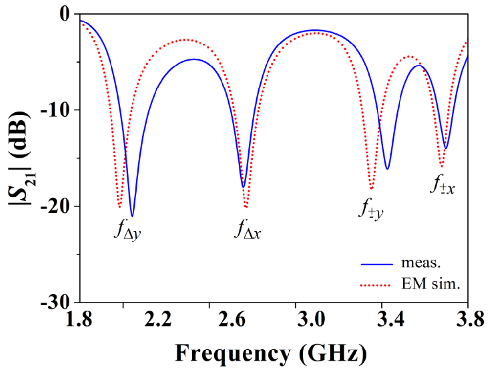 For a better comprehension of the principle of operation of the proposed sensor, let us consider the four different displacements indicated in Figure 3 from the aligned structure, that is, right, left, up, and down displacements. The resonance frequencies of the four SRRs are denoted as fΔy, fΔx, f±y, and f±x (see Figure 2). It can be seen that displacements in the ±x- and ±y-direction can be detected (by means of the resonators SRR±x and SRR±y) and measured (by the resonators SRRΔx and SRRΔy). Any other linear displacement is a combination of the previous ones, and hence it can also be detected and measured. As an illustration, Figure 4 shows the obtained transmission coefficient for Δx = 0.3 mm and Δy = 0.25 mm.