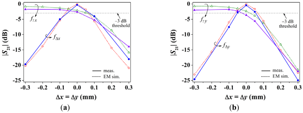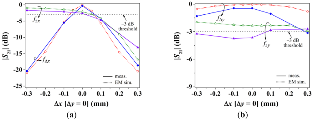 Figure 6 depicts the dependence of the notch magnitude (simulated and measured) with displacement in the ±x-direction. The measurements have been inferred by means of the Agilent E8364B vector network analyzer, whereas the simulations have been carried out by means of the Agilent Momentum commercial software. As expected, for positive displacements, the SRR±x is activated as is manifested by a clear increase in the notch at f±x, whereas the specified −3 dB threshold level is not exceeded for negative displacements (indicating that the shift is in the negative direction). The dependence of the notch magnitude for fΔx is similar and roughly linear in both directions, with a measured value of approximately −20 dB for Δx = ±0.3 mm, which is indicative of a significant sensitivity of roughly 65 dB/mm (average value). On the other hand, the notch corresponding to fΔy is approximately 0 dB, which indicates that the structure is aligned with the y-axis (for Δx = 0.3 mm the notch is slightly above −3 dB because for this sample the y-axis position sensing resonators are somewhat misaligned due to fabrication tolerances and under-etching).