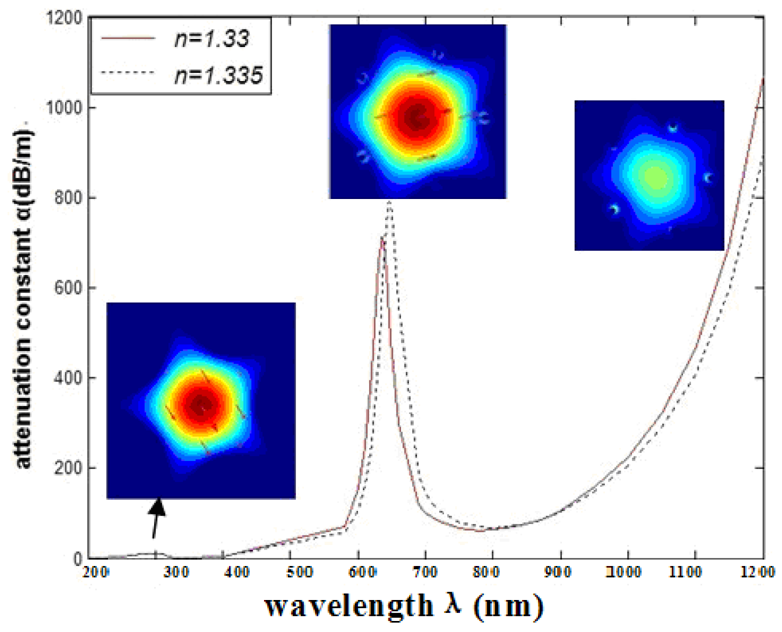 This article uses the mode power attenuation coefficient á to quantify the loss of the transmission mode, and use dB/m as the unit. Generally, the refractive index of the analyte na decides the resonance wavelength. When the incident light reaches the interface between two different media, it can cause metal free electronic resonance. SPR will change with the index of refraction of the surface change, so the SPR is so sensitive to environmental changes. The relationship between wavelength and attenuation constant of the fundamental mode of the grapefruit PCF filled with one silver nanowire of 300 nm radius is shown in Figure 2, we can get two loss peaks, which are located at 310 nm (peak I) and 635 nm (peak II) when na = 1.33 (red solid curve). It is noteworthy that the resonance peak shift of peak I is 1 nm, and that of peak II is 12 nm. It is obvious that the peak II is more sensitive than peak I. This can be explained by noting that the silver nanowire surface supports several waveguide modes which result in several peaks. Peak I is the coupling between the high-order mode and the core guided mode and peak II is the coupling between the fundamental waveguide mode and the core guided mode. In the next section we only focus on the peak II for sensing.