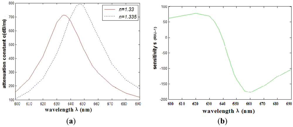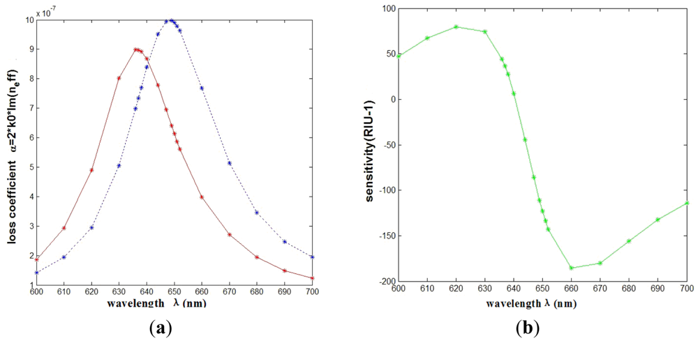 The relationship between wavelength and attenuation constant of the fundamental mode of the peak II is shown in Figure 3(a). The red and blue curves represent samples with refractive indexes of 1.33 and 1.335, respectively. The sharp loss peak is in the range of 630–650 nm. Because the fiber core and surface plasmon mode can produce resonance, the energy of light field in the core has a great loss. When the sample refractive index changes from 1.33 to 1.335, the resonance peak shifts 12 nm (Δëpeak) towards the longer wavelength.