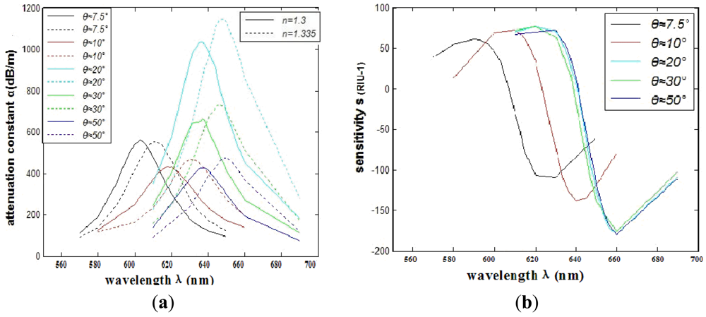 In consideration of the interaction between the two silver nanowires, we investigate the SPR sensors based on PCFs filled with two silver nanowires of different relative distances. Numerical simulation shows that when the number of the nanowires increases to two, the transmission loss coefficient and the sensitivity will change for the interaction of electromagnetic field between the two silver nanowires. Then the relative distance between two silver nanowires has changed. In order to make it feasible for real operation, we place the silver nanowires in the edge of the circle (as shown in Figure 1(a)) to have a certain degree rotation è (as shown in Figure 1(c)). The comparison of the attenuation spectra of the fundamental mode and the amplitude detection sensitivity curves is shown in Figure 4(a,b), respectively. The maximum sensitivity of the sensor reaches 2,400 nm/RIU (the sensitivity is higher than the previous value, such as the sensitivity 2,200 nm/RIU achieved by the authors of reference []) when the sensitivity of the sensor is defined as: