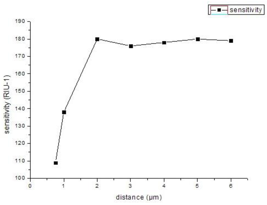 As shown in Figure 4, we can see that the SPR peak is sensitive to changes in the relative distances between the two silver nanowires. However, the sensitivity improvement has a limited value. As shown in Figure 5 numerical simulation results show that the sensitivity will increase (from 109 RIU−1 to 180 RIU−1) with the increase of relative distance between two silver nanowires within 2 ìm (è ≈ 20°), and then it tends to be stable with the continued increase. By adjusting the distance between the two silver nanowires, we can tune the resonance wavelength to a desired value. So when performing experiments, we should control the distance betwwen the two silver nanowires.