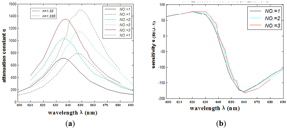 We can get the maximal sensitivity at 647 nm, and equals 178 RIU−1. It is typically a safe assumption that a 1% change in the transmitted intensity can be detected reliably, which leads to a sensor resolution of 5.62 × 10−5 RIU.