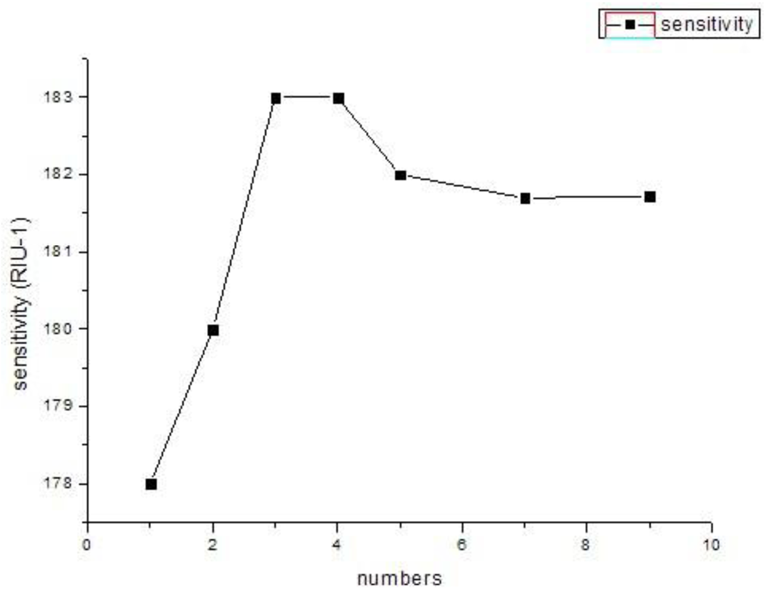 Meanwhile, as shown in Figure 7, the sensitivity will remain relatively stable with the continuous increase in the number of silver nanowires. We can explain this by noting that the increase of the numbers of silver nanowires has no enhanced coupling between the plasmonic mode and core-guided mode. So with this numerical result, better results are expected to be obtained filling with nanowires, which is more convenient to operate in practice than using nanowires. It can overcome the difficulties of coating the holes in the photonic crystal fiber and the control of the distance between the silver nanowires.