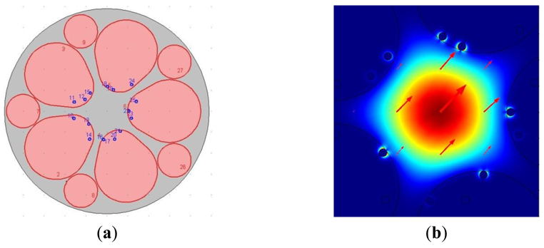 We utilize the self-designed grapefruit PCF made of silica in the simulation []. The diameter of the core is approximately 10 microns and the large hole of the PCF is easy to fill for measuring fluid samples. The structure of the PCF is shown in Figure 1, with each grapefruit hole occupied by one silver nanowire of 300 nm radius. The refractive index of the fused silica optical fiber can be determined by the Sellmeier equation and for the relative dielectric constant of silver we referred to the Handbook of Optics []. In recent years, PCF-based SPR sensors used in refractive index sensing of aqueous analytes have attracted much attention [,]. All holes are filled with liquid samples (na = 1.33) in this paper.