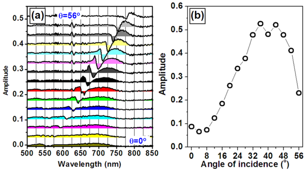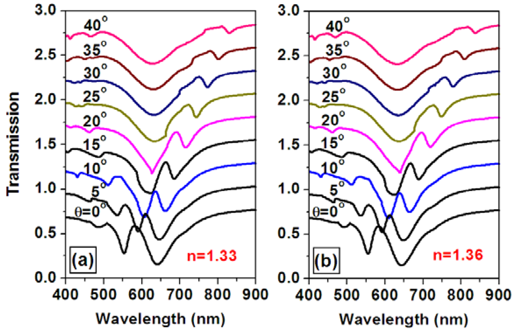 Theoretical simulations were performed to demonstrate optimization of the sensor signal through tuning the angle of incidence or the spectral position of the overlap between the waveguide and plasmonic resonance mode. Figure 11 shows the angle-resolved tuning of the transmission spectrum through a WMPC device consisting of gold nanolines on top of the ITO waveguide for the TM polarization, where the incident angle is increased from 0 to 40 degrees. The spectrum of particle plasmon resonance is centered around 630 nm and the waveguide resonance mode in increased from 582 to 818 nm (the longer-wavelength branch). Figure 11(a,b) shows the simulation results for a refractive index of 1.33 and 1.36, respectively. If using the transmission spectrum at a refractive index of 1.33 as the blank and that at 1.36 as the signal to calculate the optical extinction spectrum, the changing of the sensor signal as a function of the angle of incidence may be obtained, as shown in Figure 12. Clearly, the amplitude characterized by the peak-to-valley difference in the sensor signal is strongly modified by changing the angle of incidence. The largest sensor signal can be observed at an incident angle about 20°.