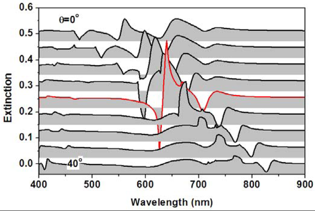As shown in Figure 2(b), the coupled mode between the waveguide resonance and PPR appears as a dip in the extinction spectrum, implying enhanced transmission within the corresponding band. The longer-wavelength branch of the coupled mode is tuned from 653 to 830 nm. Figure 2(c) shows the angle-resolved tuning properties of the waveguide resonance mode for TE-polarized incident light. The narrow-band extinction peak is tuned from 645 to 826 nm. However, the waveguide resonance mode is actually superimposed on a broad-band spectrum that is centered around 600 nm. Clearly, the narrow-band and the broad-band features interact with each other through a simple linear superimposition. The broad-band feature results from the PPR of the small gold nanoparticles that are doped and randomly distributed in the photoresist after the annealing process, which can be observed between the periodically arranged gold nanolines. They induced extinction of the light through PPR without contributing to the modulation on the waveguide resonance mode due to their random distribution. Thus, no coupling between the waveguide resonance and this portion of PPR can be observed.