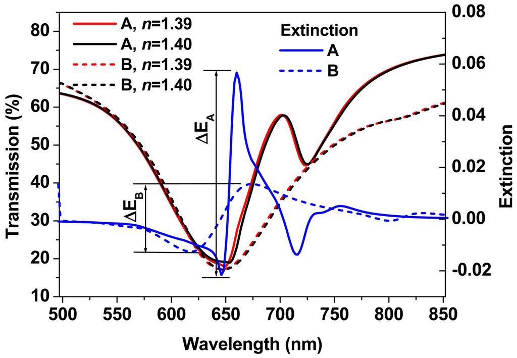 The spectroscopic response of particle plasmon resonance is observed as a broad-band dip in the transmission spectrum due to the strong scattering and absorption of the light by the metallic nanostructures, which shifts to the red with increasing the environmental refractive index. Actually, how this spectral shift depends on the change of the environmental refractive index actually determines the sensitivity of sensors based on particle plasmon resonance. As shown in the simulation results in Figure 6, the dashed-red and dashed-black curves demonstrate the transmission spectrum of the gold-nanowire gratings without coupling with the waveguide resonance mode (sample A) for an environmental refractive index of 1.39 and 1.40, respectively. A spectral shift (Δλ) of only 1.8 nm is measured between these two curves, which is evaluated at the right edge of the transmission spectra. This leads to a sensitivity of Δλ/Δn = 180 nm/RIU (refractive index unity). Such sensitivity is quite small if compared with the conventional sensor devices. Due the broad-band properties of PPR, it is actually difficult to analyze the dip-to-dip spectral shift. Therefore, it is more convenient to characterize the sensor signal by the extinction spectrum, which is defined by: