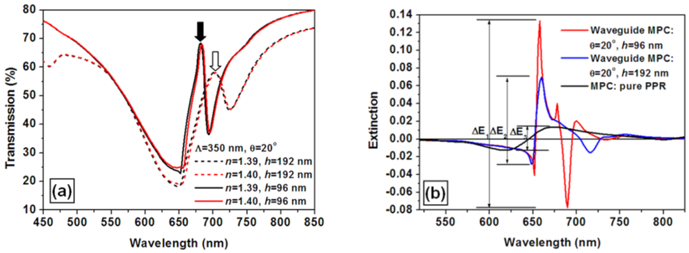 Figure 8(a) shows the simulation results of the transmission spectra for an incident angle of 20 degrees and for an environmental refractive index of 1.39 (black) and 1.40 (red) and for the structural parameters of the WMPC device of Λ = 350 nm, h = 96 nm (solid curves) and h = 192 nm (dashed curves). The reduction of the waveguide thickness from 192 nm to 96 nm leads to significant narrowing of the coupled mode, as can be verified by comparing the solid and the dashed peaks marked by the filled and empty arrows, respectively. This kind of narrowing results in further enhancement of the response sensitivity of the WMPC device.
