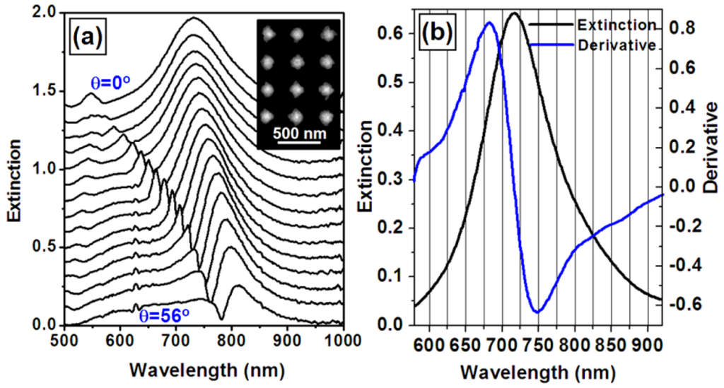 Another approach for improving the sensitivity of the WMPC sensors is to optimize the angle of incidence of the light onto the device. This is based on the principle that the waveguide resonance mode should be coupled with the spectrum of PPR at the position with the largest changing rate or the largest slope of the curve. Furthermore, the sensor signal due to the shift of the optical extinction spectrum is related directly to the derivative of the extinction spectrum. Then, the extremes of the derivative of the extinction spectrum may be used to guide the optimization of the sensitivity of the sensor device. Thus, the waveguide resonance mode may be tuned to overlap the spectral position of those extremes through tuning the incidence angle of the light. The black curves in Figure 9(a) are the measured optical extinction spectra of the WMPC device with the angle of incidence increased from 0 to 56 degrees in steps of 4 degree. The SEM image of the corresponding WMPC structures is shown in the inset. The black curve in Figure 9(b) shows the optical extinction spectrum of PPR of the gold nanostructures without coupling with the waveguide resonance, which is actually the optical extinction curve at θi = 0 in Figure 9(a) and has very little overlap with the waveguide resonance mode. The blue curve in Figure 9(b) is the calculated results through differentiation operation on the black curves. The extremes of the blue curve can be found at about 680 nm and 750 nm. Thus, the sensitivity of the sensor device may be optimized by tuning the waveguide resonance mode to approximately 680 or 750 nm. Figure 10(a) shows the tuning of the derivative curves of the measured optical extinction spectra in Figure 9(a). If using the peak-to-valley difference to characterize the amplitude of the sensor signal, a curve for the optimization can be obtained in Figure 10(b), where the amplitude is plotted as a function of the angle of incidence. The peaks of the curve are found for incident angles in the range from 36 to 44 degrees, corresponding to the waveguide resonance mode ranging from 690 to 730 nm. This basically verifies our proposed principles.