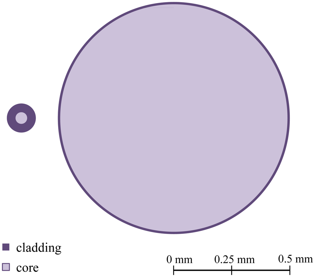 The first single mode (SM) SI-POF was developed and presented by Koike et al. [19]. Compared to SM-GOF, the attenuation coefficients were very high (200 dB/km for 652 nm). Additionally, SM-SI-POF had lost the greatest advantages of the conventional POF: ease of handling and low-cost. Another type of SI-POF is formed by multi-cores (MC) and was first developed by AGC Asahi Chemical. In this type of fibers, multi-cores (up to about 200) are assembled during the manufacturing process, forming a POF with an overall diameter of 1 mm [20].