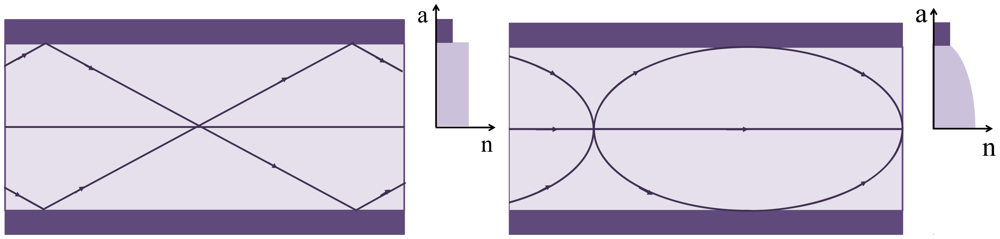 Like GOF, the first developed POF had a SI profile. The POF has high values of numerical aperture (NA), typically 0.50, that translate into a very large number (104–106) of propagating modes. Figure 1 presents a schematic diagram of the NA and dimensions of a multimode (MM)-GOF and MM-POF. This high value facilitates the coupling of light in the fiber and reduces the losses associated with macrobending. Besides, it allows the analysis of the POF by geometric optics replacing the concept of modes for light rays. An important disadvantage is the greater modal dispersion and consequent lower bandwidth. The first POF with lower NA values, with a NA near 0.30, was presented by Mitsubishi Rayon [18] in 1995. Currently, all low NA POFs present, in fact, a double step index (DSI), which consists of two claddings surrounding the core.