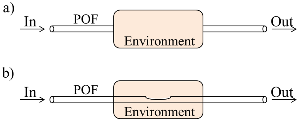 In the scientific literature, several sensing techniques used in the development of POF based sensors, are described, such as backscattering (optical time domain reflectometers, OTDR [24–26] and optical frequency domain reflectometers, OFDR [27,28]) and long period gratings [29]. Since most plastic optical sensors are based on intensity variation detection, a more detailed description will be presented for transmission, reflection, spectroscopic and evanescent field transduction mechanisms. A technique based in path difference will also be presented [30]. In addition, FBGs and interferometry will also be briefly described due to its increasing application.