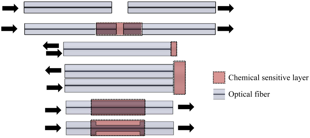 Despite the diversity of possible configurations, they can be classified into two broad classes, namely extrinsic and intrinsic sensors (examples are shown in Figure 3). The former is characterized by the use of the optical fiber as a means of optical signal transmission to an external environment. In the intrinsic scheme, the optical signal doesn't leave the optical fiber.