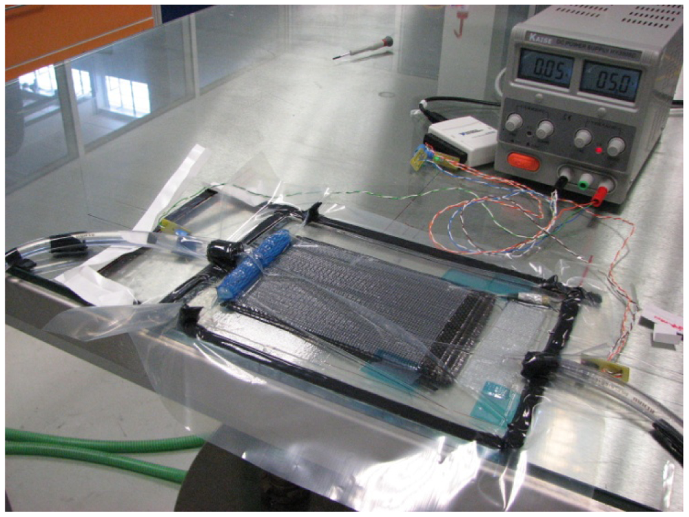 A recent area where POF sensors have been applied is in the development of smart structures. Cortes et al. [85] presented a study in which either GOF-FBG and POF sensors were introduced into a glass fiber laminated composite structure and into a shape memory Ni-Ti alloy. The POF sensor was based on the measurement of the displacement of two cleaved fiber surfaces contained within the tube. The sensors were introduced to monitor the deflection of the laminate during the activation phase. Both types of sensors were also integrated into carbon fiber reinforced composite structures. However, in this study the principle of the POF sensor relied on intensity variation in a side-polished fiber. This integration allowed a real time monitoring of the production process (shown in Figure 6), including the progression of resin cure over time and the determination of the infusion rate [86].