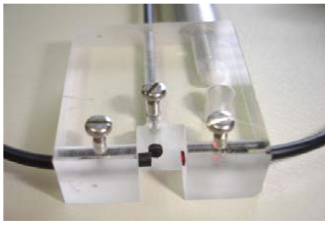 Regarding turbidity sensors, there are some studies for marine applications [103] and wine industry applications [104]. These particular studies were focused in the determination of low suspended sediment concentrations, typically 2–4 g·L−1. On the other hand, Campbell et al. [105] presented a sensor designed for measuring high sediment concentrations, up to 10 g·L−1. The system was created to perform measurements using a linear fiber bundle design. However, due to the size of the suspended particles, the authors didn't solve the variability of the optical signal. Later, Postolache et al. [106] developed a system with four optical fibers, two used as emitters and two as receivers. Despite the apparent complexity of the system, its capability was not optimized, since both transmitted and scattered signals were used for the determination of only one parameter, in this case the concentration of suspended particles. In addition, the sensor performance was not tested in real samples. The system proposed by Bilro et al. [107] was also based on the transmission and nephelometric method, similar to the one presented by Garcia et al. [104]. Transmitted and scattered output signals were characterized and evaluated for three configurations, using a large range of clay concentration. The configuration selected was the one that presented the best balance between the sensitivity of the sensor and its capacity to operate with suspended particles of large dimensions that are a characteristic in soil erosion studies (see Figure 8). Comparing to OBS-3+, a standard commercial system, a good correlation was obtained. Nevertheless, authors pointed that with the developed system the operation mode was easier, because it was small sized, cost-effective and the output didn't depend on the setup. Later, a study of the sensor performance was presented [108]. This was tested with artificially-created samples, with a wide range of concentration of three distinct materials, i.e., white flour, red clay and black ashes. Results showed that direct light loss proved to be a good indicator of the sediment concentrations of the artificial samples and, also, the scattered-light signal indicated potential as a complementary signal for the identification of the reflectivity of the particles. A second test was accomplished to determine the sensor's sensitivity based on six particle size classes of ashes. Results suggested that the concentration misreading due to particle diameter could be corrected using output signals variability.