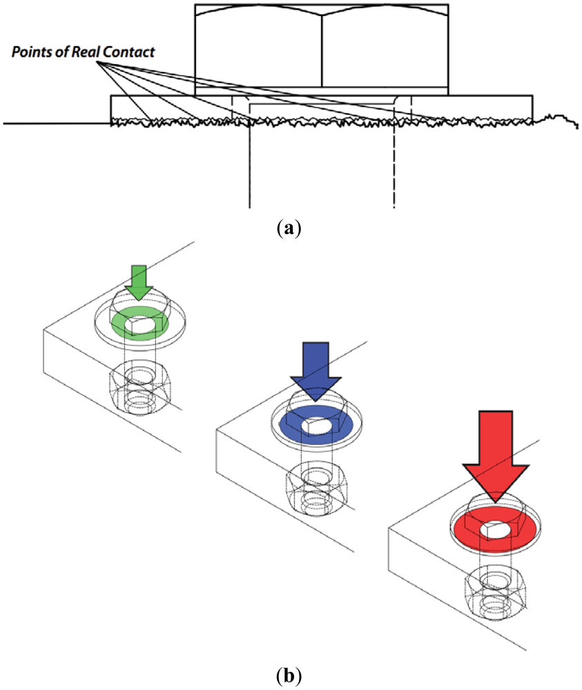 It has been reported that the number and size of points of contacts increase with increasing tension in the bolt [24,25]. Figure 1(b) illustrates a schematic representation of the RAC growth due to increase in bolt tension. As can be observed from this figure, the higher the tension (signified with “arrow”), the larger the RAC between the plate and the washer (signified with the “donuts”). The RAC is, in fact, different from the apparent area of contact, but at high-tension levels the difference between those becomes minimized [24]. The saturation of the RAC at a specific preload level establishes the maximum tension level that should be applied to the bolt for optimal and safe operation. The way in which the RAC grows is of special interest for estimating the tension. As illustrated in Figure 1(b), the RAC grows from the center of the washer towards the washer perimeter. This behavior can be explained by analyzing the way the tension is applied to the bolt head. First, the preload transforms into a pulling force exerted to the head center. The surface peaks closer to the center are then affected more than the ones in the perimeter and therefore the expansion of the RAC can be predicted as propagating radially outward.