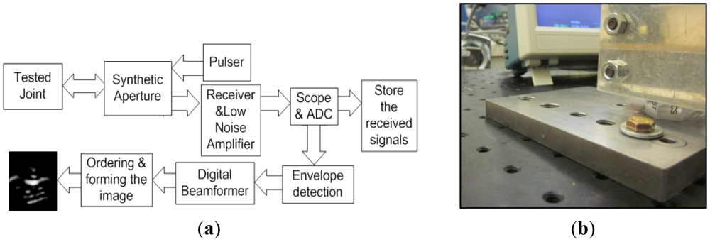 The proposed concept was investigated by experimental studies. The experimental setup is illustrated by the block diagram (Figure 4(a)). The tested joint was composed of a 1018 steel plate of 12.7 mm (½ in) thickness, a 6.4 mm (¼ in) grade 8 bolt and stainless steel washer with 19 mm (¾ in) of external diameter, as illustrated in Figure 4(b). The joint was lubricated with general purpose oil in order to facilitate the tightening process. The wideband excitation pulses were generated and the echoes were received and amplified by a pulsar-receiver (Olympus 5072PR, Olympus NDT Inc., Waltham, MA, USA). The received signals were displayed/digitized by a scope (Tektronix TDS 2024B, Textronix Inc., Beaverton, OR, USA). The digitized signals are stored in a computer and the image is generated using a custom-designed MATLAB code.