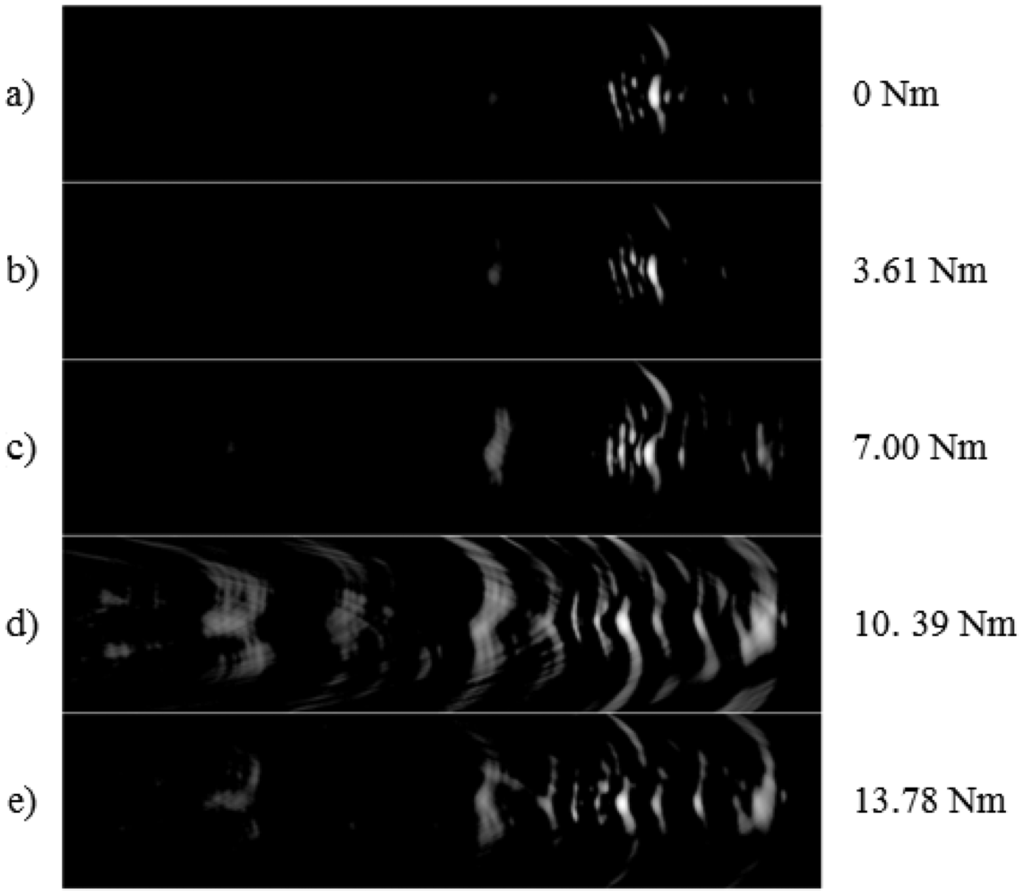 The results were obtained for five different torque levels (with 3.61 Nm torque increments) using the experimental set-up detailed in the previous section. Figure 6 illustrates the experimentally obtained reconstructed images with these different torque levels. In this figure, the horizontal (range) and the vertical extensions of each image are 2.37 × 2.54 cm, respectively. The range extension of the image was 0.92 cm to 3.29 cm and the vertical extension was from −1.27 cm to +1.27 cm where the transducer array is located at the origin. As can be observed from this figure, there was a clear change in the shape of reconstructed images, especially the location of the first reflection from the bolted joint when different torque values are applied. It was observed that increasing the applied torque resulted in displacement of the first reflection boundary towards the transducer array. Furthermore, even in the reference condition of no torque, a clear reflection from the plate hole was observed. It should also be pointed out that even with a very loose tightening of the bolt (corresponding to torque value 3.61 Nm in Figure 6), a noticeable movement of the reflective boundary towards the left side of the image is observed. As the applied torque is increased, images became noisier due to increase in the real area of contact however there was a similar trend of movement of reflective boundary towards the array. One can also observe that the brightness of the images is increasing as the torque is decreased since the response is getting stronger.