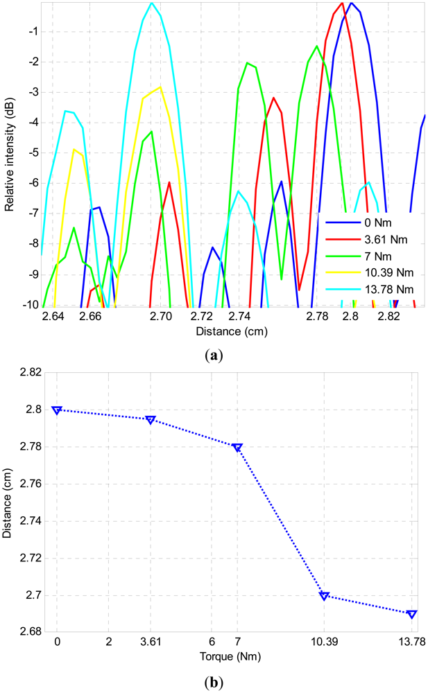 To quantify the displacement of the first reflection boundary from the joint center towards the transducer array as a function of applied torque, the relative average signal intensity of the reconstructed images as a function of distance from the transducer array is plotted in Figure 7(a). The 1-D average plot, which is a simplification of the 2-D reconstructed image (Figure 6), is obtained by taking the average of lateral dimension of the 2-D image. The 1-D plot allows establishing the exact position of the maximum intensity point of the 2-D image. The position of this point is used to estimate the actual distance change of the reflective boundary. Figure 7(b) illustrates the position of the first reflection boundary as a function of the applied torque. Firstly, one can clearly observe from the maximum intensities of the reconstructed images that there is a clear trend of moving the reflection boundary towards the transducer array as the torque is increased. It can also be observed from Figure 7(b) that the distance between the position of first reflection boundary with no torque applied and maximum allowable torque of 13.78 Nm is 0.1 cm. The first reflection boundary corresponding to rest of the torque values are positioned between these two extreme values. Note that the first reflection boundary position change does not have a linear trend with increasing torque. This expected behavior can be explained by the fact that with this phased array image reconstruction technique, we are quantifying the location of the first reflection boundary, not the real area of contact (RAC). As a result, the boundary distance and the torque should not be expected to have a linear relationship. It should be pointed out that this non-linear variation of the movement of the first reflection of boundary as a function of applied torque can easily be used to estimate the torque (hence the tightening of the bolt) by just obtaining the distance of the first reflection boundary from the transducer array. Another important characteristic of the Figure 7(b) is the fact that RAC saturation takes place around 10 Nm corresponding to first reflection boundary position of 2.7 cm.