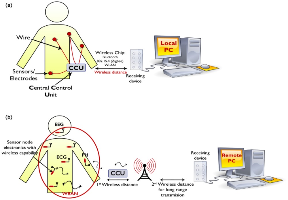 WBANs application in the medical field are composed of wearable and implantable sensors that can detect information from the human body and send it to a central unit as shown in Figure 2. These sensors have some characteristics such as small, low-power detection and have the capability to detect medical signals data from the control unit. There is a difficulty in the monitoring devices that are not completely wearable where the wires are used to connect many sensors. Yuce [2] explored a vision to the future of medical sensor networks should be miniaturized and also wearable sensors that can communicate with the receiving device wirelessly.