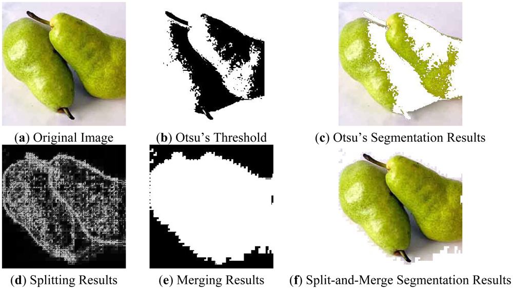 Figure 1(d–f) show our method. The splitting process splits the image to homogeneous small squares (Figure 1(d)) according to the splitting rules, and then combines the connected squares according to the merging rules (Figure 1(e)). The final extraction (Figure 1(f)) shows this split-and-merge process neatly extracts the whole area of fruits.