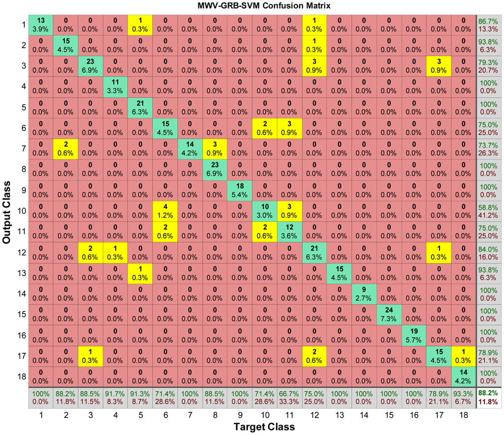The confusion matrix of GRB kernel MWV-SVM is shown in Figure 10. Each column of the matrix represents the instances in target class (actual class), while each row represents the instances in the output class (predicted class). The number in ith row and jth column represents samples whose target is the jth class that was classified as ith class. All the misclassification cases are highlighted in yellow.