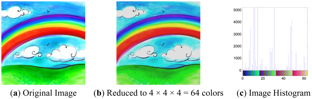 Figure 2(a) is an original rainbow image with RGB channels from 0 to 255, so there are totally 256 × 256 × 256 = 224 colors. Figure 2(b) uses four bins to represent each color component, Bins 0, 1, 2, 3 denote intensities 0-63, 64-127, 128-191, 192-255, respectively, so there are in total 4 × 4 × 4 = 64 colors. Figure 2(c) is the histogram of Figure 2(b), where the x-axis denotes the index of the 64 colors, and the y-axis denotes the number of pixels.