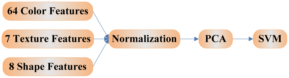 Step 2. The 79 features are extracted from each 256 × 256 image. These 79 features contain 64 color features, seven texture features, and eight shape features.