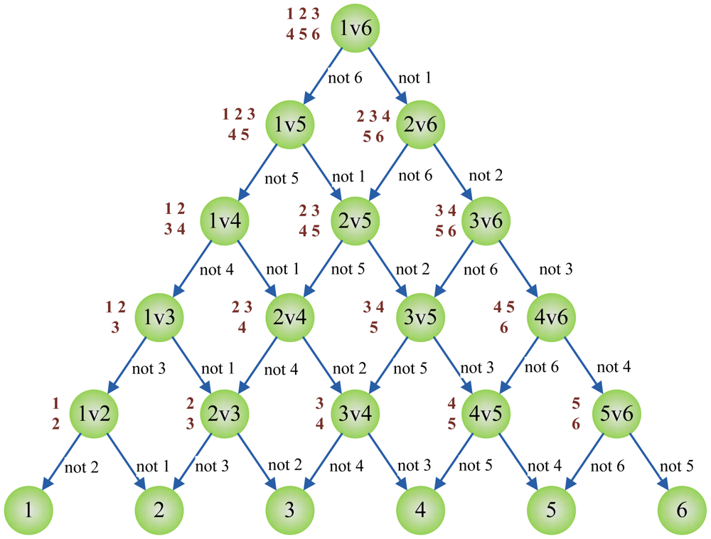 Figure 5 below shows the DAG for finding the best class out of six given classes. Here, the root node and intermediate nodes represents the individual binary SVM, whereas the leaf nodes represent the output label. Given a test sample x starting at the root node, the individual binary SVMs are evaluated. The node is then exited via the evaluation result to either left edge or right edge. The next SVM's function is evaluated again until the leaf node is reached. Therefore, DAG-SVM costs less computation time compared to MWV-SVM. In this case, the MWV-SVM needs to cover all nodes of 15 individual SVMs, yet the DAG-SVM only needs to evaluate only five individual SVMs.