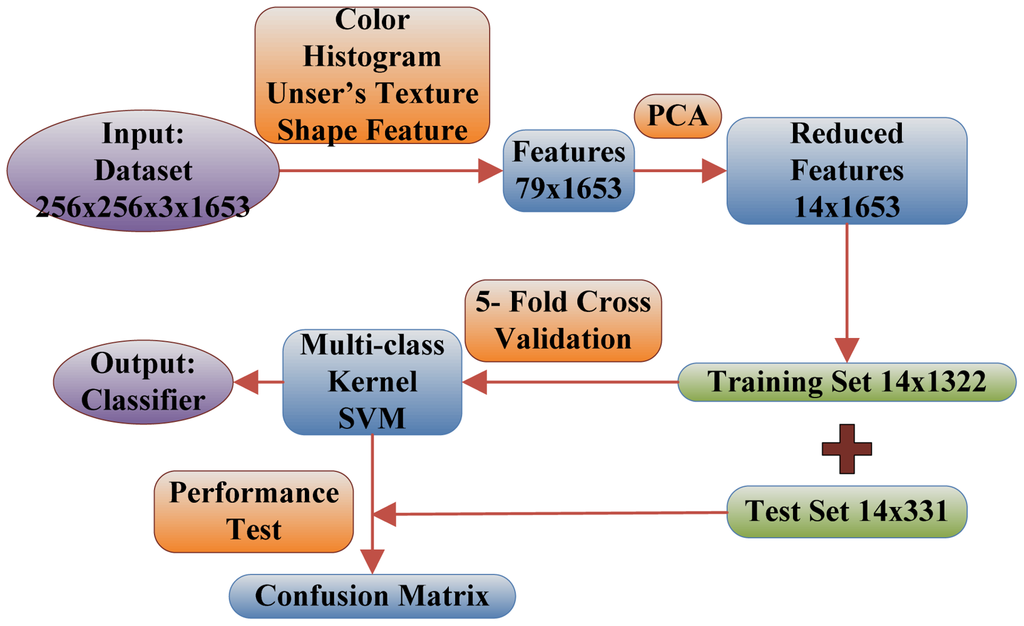 In total, there are 79 features (64 color features + seven texture features + eight shape features) extracted from a given image. Excessive features increase computation time and storage memory, which sometimes causes the classification process to become more complicated and even decrease the performance of the classifier. A strategy is necessary to reduce the number of features used in classification.