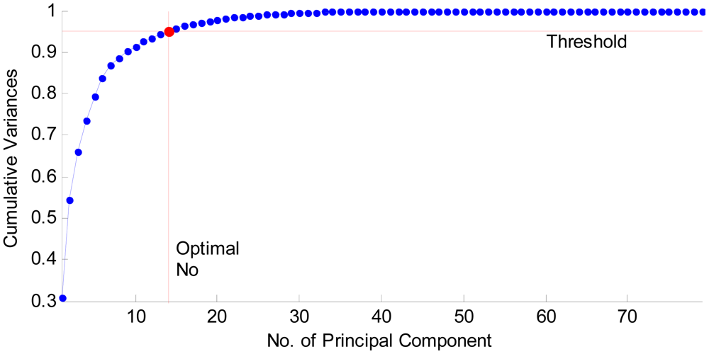 Principal component analysis (PCA) is an efficient tool to reduce the dimensionality of a data set consisting of a large number of interrelated variables while retaining the most significant variations [17]. It is achieved by transforming the data set to a new set of ordered variables according to their degree of variance or importance. This technique has three effects: (1) it orthogonalizes the components of the input vectors so that they are uncorrelated with each other, (2) it orders the resulting orthogonal components so that those with the largest variation come first, and (3) it eliminates the components in the data set that contributes the least variation [18].
