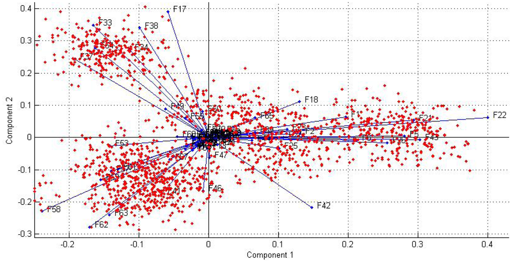 The loading plot on principal component 1&2 is shown in Figure 9, from which we can analyze the subsequent role of 79 features for classification. It will guide us to select features more effectively and to identify the relationship between samples and features.
