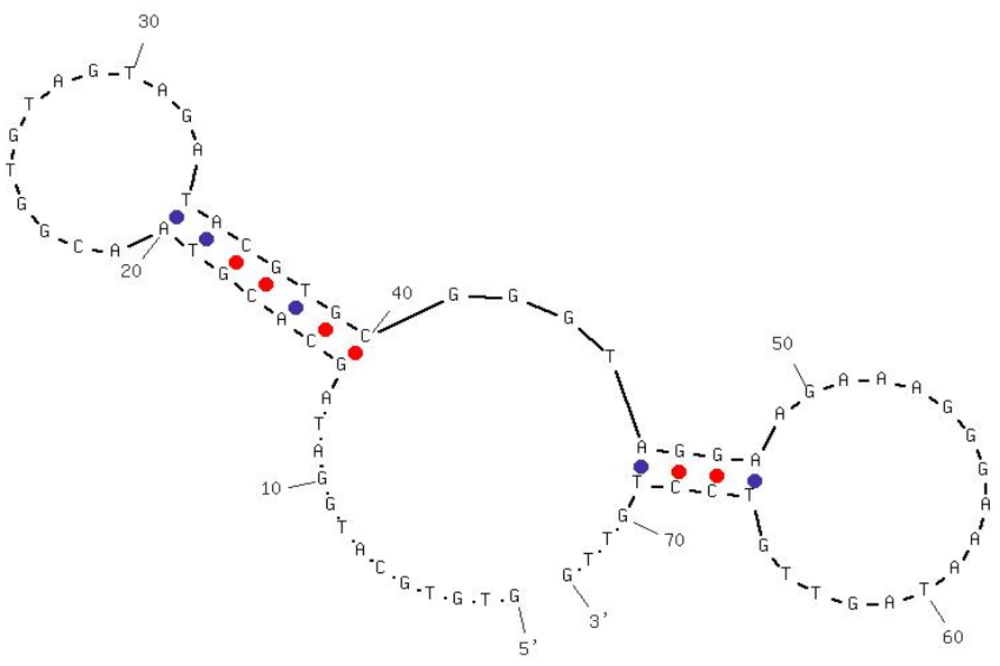 Aptamers specific against H5N1 were described in detail in our previous study [19,20]. Briefly, selection and characterization of DNA aptamers were carried out using Systematic Evolution of Ligands by EXponential enrichment (SELEX) technology and surface plasmon resonance (SPR). The selection was started with an ssDNA (single-stranded DNA) library of 1014 molecules randomized at central 74 nt. For the first four selection cycles, purified hemagglutinin (HA) from AIV H5N1 was used as the target protein, and starting from the fifth cycle, entire H5N1 virus was applied in order to improve the specificity. After thirteen rounds of selection, DNA aptamers that bind to the H5N1 were isolated and three apatmer sequences were further characterized by sequencing and affinity binding. The best aptamer candidate had a dissociation constant (KD) of 4.65 nM as determined by SPR, showing a strong binding between the HA and the selected aptamer. The specificity was determined by testing non-target AIV H5N2, H5N3, H5N9, H9N2 and H7N2. Negligible cross-reactivity confirmed the high specificity of selected aptamers. The sequence and predicted secondary structure of the aptamer used in this study is shown in Figure 1.