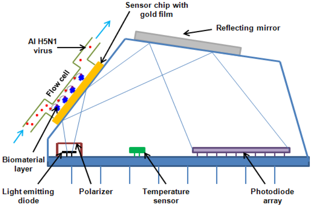 The miniature Spreeta SPR sensing chip is a fully intergrated SPR sensor element containing an LED (light emitting diode) light source, a gold SPR surface, a reflecting mirror that directs the reflected light to a photodiode array and a temperature sensor. The intensity of polarized light reflected off a thin layer of gold on the surface of a prism shows a dependence on the angle of incidence. Attachment of viruses on the aptamer immobilized gold surface resulted in the change of thickness of the gold surface, and consequently the change of angle. The difference between angles (before and after) is highly related with the properties of the viruses.