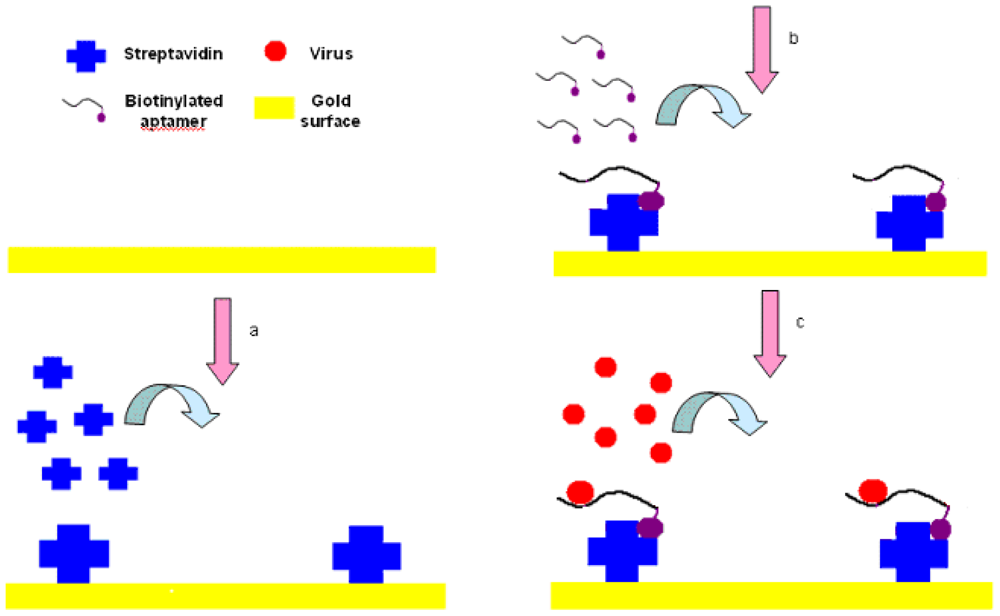 Aptamers are artificial oligonucleic acid or peptide molecules that can bind to a specific molecule such as amino acids, drugs, viruses, proteins, other molecules and even cells, tissues and organisms with high affinity and selectivity. Aptamers were developed in 1990 at two independent labs: the Gold lab [11] and the Szostak lab [12] in the USA. Recently, a variety of aptasensors were investigated for different applications, such as an electrochemical biosensor for detecting the interferon gamma (IFN-γ) [13], a capacitive biosensor for the detection of C-reactive protein [14], and a fluorescent biosensor for measurement of potassium ion [15]. Some research on aptasensors for the detection of various viruses have been reported, including the HIV-1 Tat protein [16], hepatitis C virus [17], and herpes virus [18]. Some of them chose RNA aptamers which are less stable under harsh conditions and cannot be easily used in the field when compared with DNA aptamers. Very recently, Li et al. [19,20] developed aptamers specific to AIV H5N1 using the SELEX method and their results showed the aptamers were compatible with available monoclonal antibodies in both specificity and affinity. SELEX refers to the systematic evolution of ligands by exponential enrichment which begins with a random sequence combinatorial library of oligonucleotides which are screened by a repeated process of in vitro selection and amplification [21]. Each member in a library is a linear oligomer of a unique sequence and the molecular diversity is dependent on the number of randomized nucleotide positions [21].